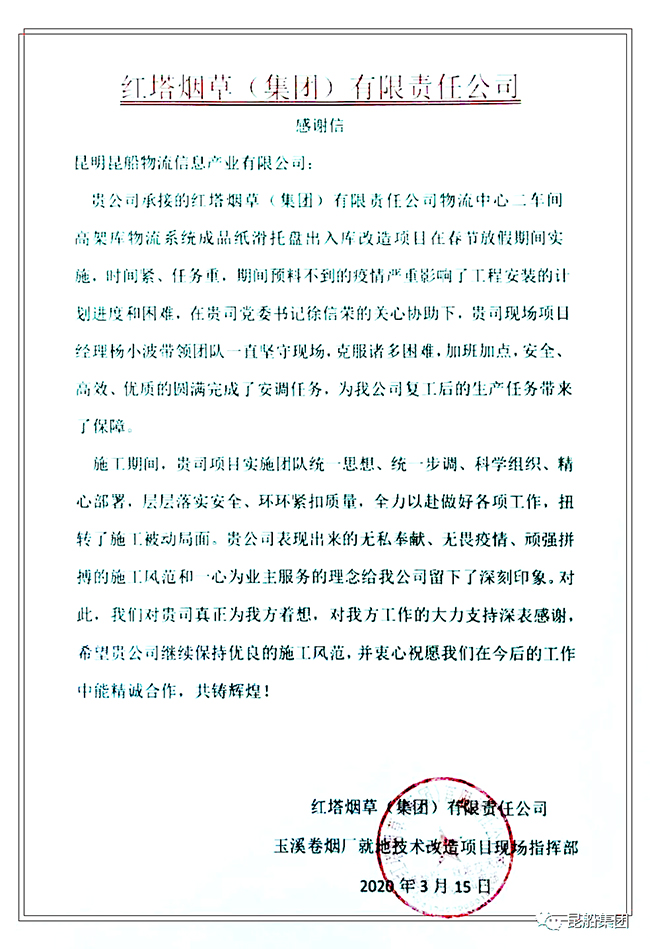 在疫情爆發(fā)之際,在春節(jié)假期之時,昆船物流公司領(lǐng)導(dǎo)、技術(shù)骨干紛紛組成突擊隊,奔赴玉溪卷煙廠、長沙卷煙廠等地,保障項目節(jié)點按期完成,他們的不畏困難、不提條件、主動請纓的精神深深的打動著所有人。